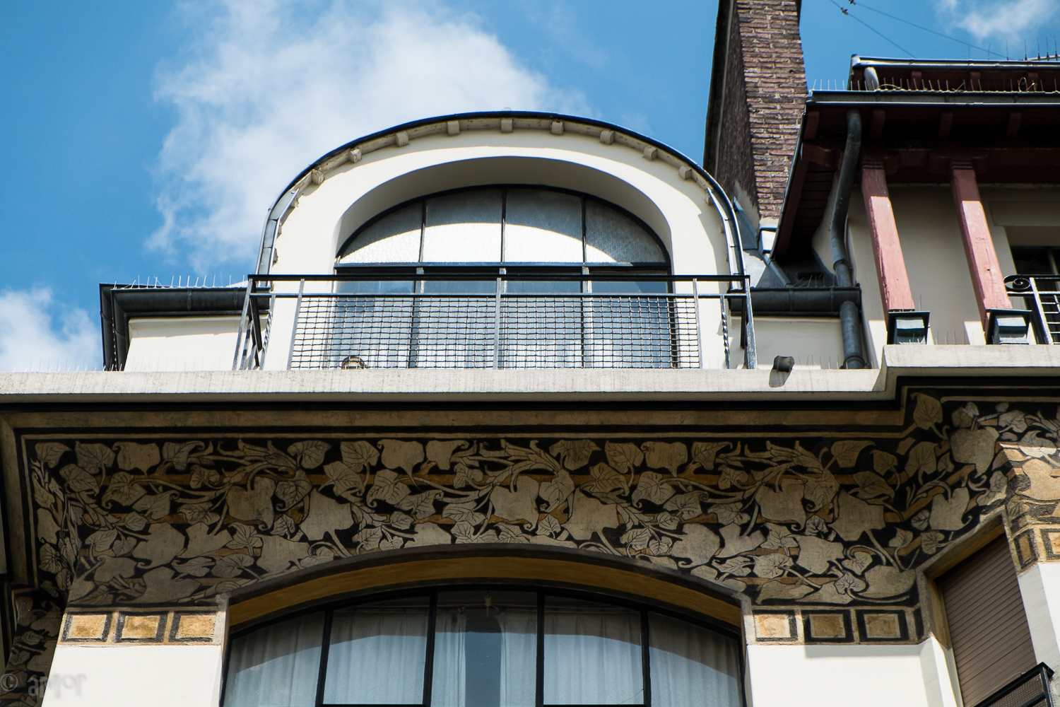La décoration des parties hautes est composées de motifs floraux (tendance Art Nouveau). La porte d’entrée est en métal et verre dépoli.