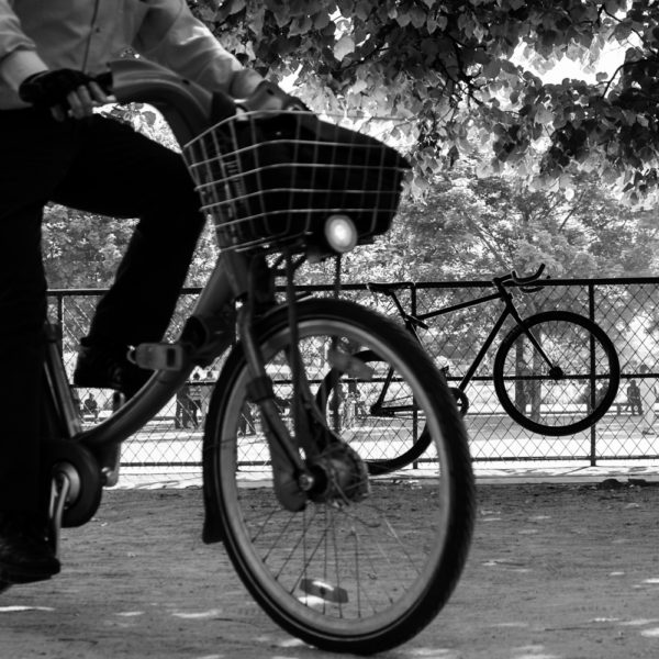 Plus loin un vélo accroché aux grilles dessine un joli graphisme, j’attends de voir ce qui va se passer, c’est un Vélib un peu égaré qui l’emporte.