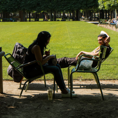Dans le Jardin des Tuileries, la lumière est forte, les ombres prononcées. Les promeneurs choisissent leur camp.